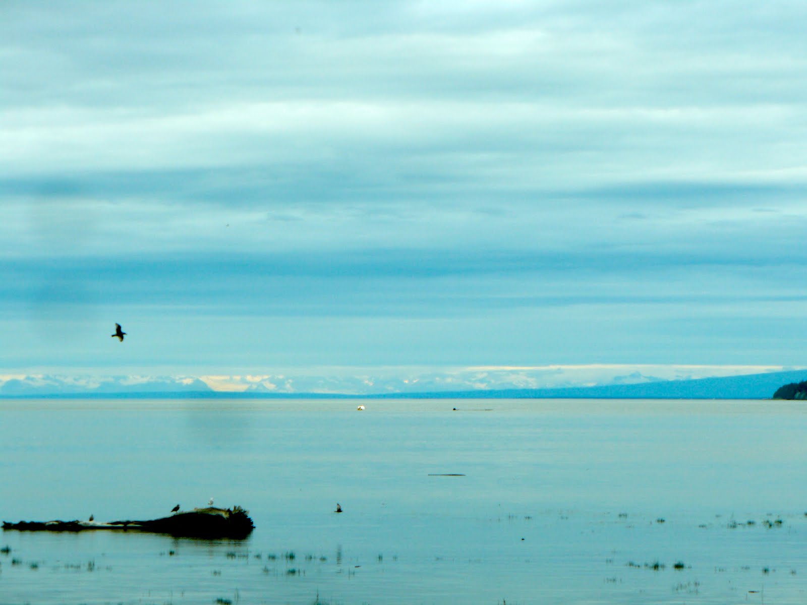 After espresso, the obvious next step is to see the Pacific Ocean. Anchorage is fantastically organized and so I walk, without fear of getting lost, heading slightly downhill toward Cook Inlet. I parallel to the train tracks at the edge of town, following the Tony Knowles Coastal Trail. It is only me, my two feet, and a small daypack. Behind me, the city is still waking up. Within half and hour, I’ve glimpsed the glassy surface of the ocean, seagulls shouting their impatience across the inlet. In the distance, I see the base of the Alaska Range, their high peaks shrowded in clouds like shy, old men.