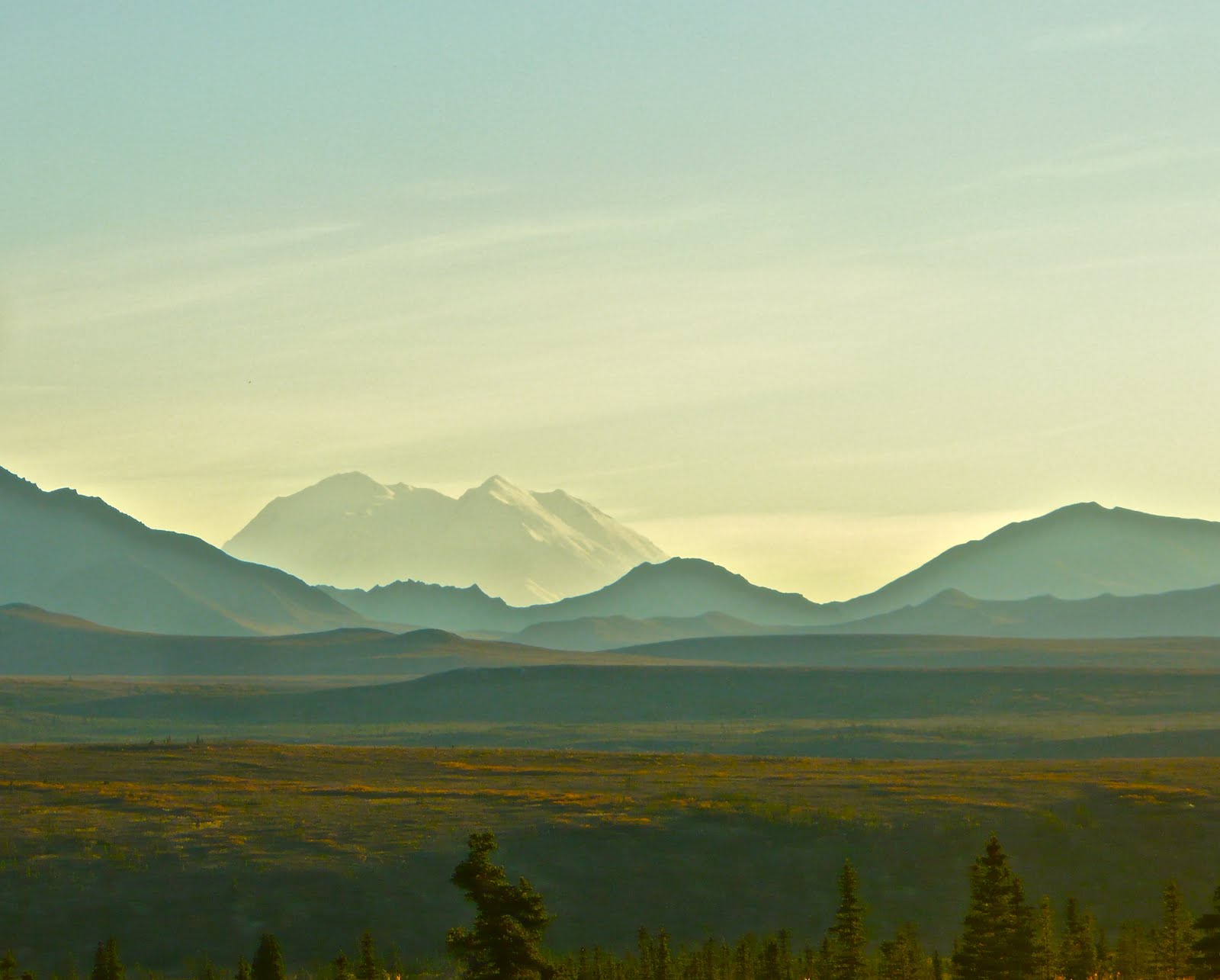 And of course before the rose-blossom light is the gentle hazing that begins slowly but surely as an ocean tide. It tends to blur the distance between one place and another, as evidenced in this photo I took of Mt. McKinley around 7:30 at night: