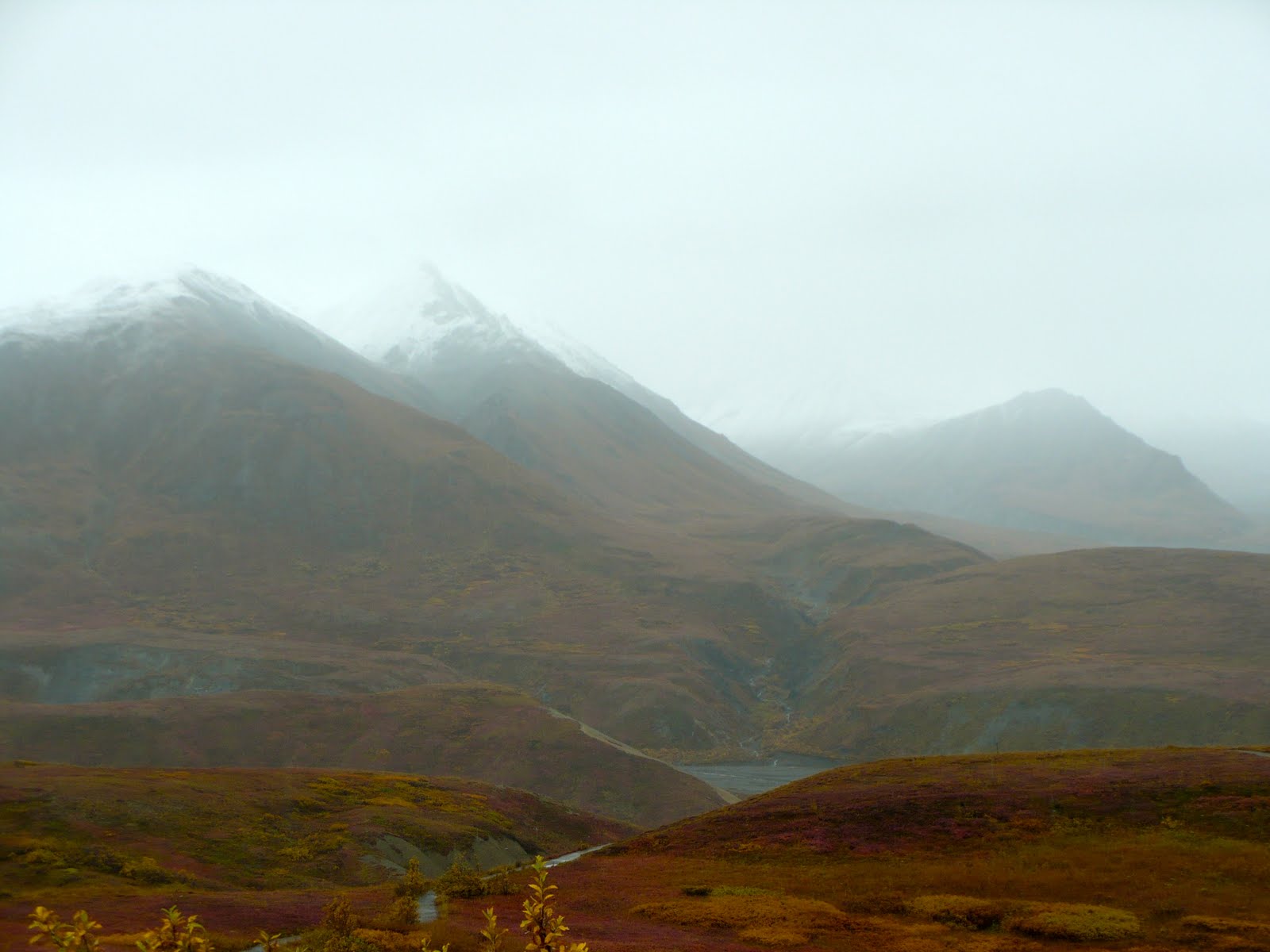 [Braided river at Teklanika along the Parks Road. Note the fresh “termination dust” that had fallen overnight and continued throughout the bus ride. “Termination dust” is the Alaskan phrase for the first snow signifying the end of fall, which lasts about 3 weeks here, and the beginning of winter, which lasts about 5 months.]