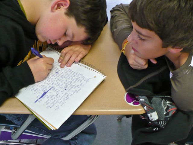 [After a few prompts, I have the students read their stories out loud to a partner, and in turn each partner offers one suggestion for improvement. These boys finished sharing early and the one on the right—who is a very strong writer, miles ahead of the others—settled in to watch his friend finish the rest of a story. “I just want to see what he’s going to write next,” the boy said. “I can’t wait to find out!”]