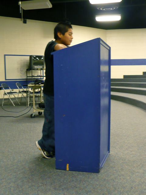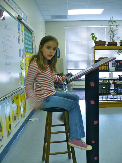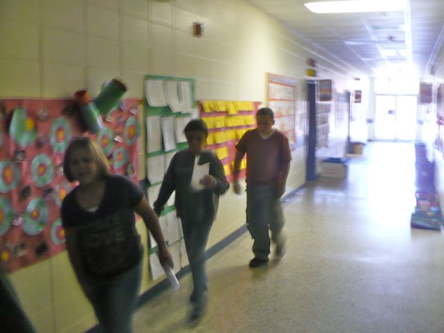 [All but one class held their Open Mic in the school auditorium, but in order to walk down the halls without all of them racing ahead of me, I asked the students to limp with me. They loved the idea, hamming it up as we hobbled in a single-file line of 25 “limping” students bemoaning their “broken” feet.]