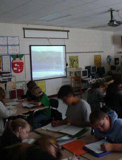 Today I was pleasantly surprised, as it became clear that more of the 6th grade class was “with me” than I thought. Almost every single one of them completed their homework, which enabled us to seamlessly practice what I call “the 2 P’s of presenting”—projecting and pacing. The 21st Century Whiteboard that was so awkward yesterday came in handy today, as I led the students through a picture-prompt. Rather than have to pass the photo around the room, giving students only a short glance at it, I was able to project a wall-sized photo of the photo (the teacher did something fancy from her desk, clicked two buttons, and viola!). Check out this shark/surfer image that had the kids chomping at the bit to write “what happens next” in the story: