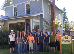 [Fishtrap Coffin House in summertime, with some happy workshop participants on the front lawn]