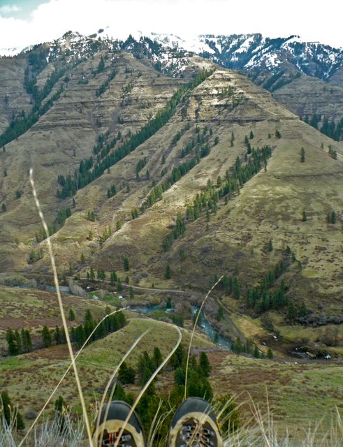 [The Imnaha Writers’ Retreat is located at the bend in the river in this photograph, straight ahead from my right foot and on the near side of the river.]