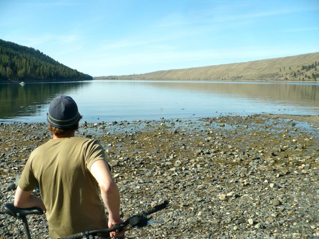And some days, it’s so gorgeous out that you just have to call it quits mid-afternoon and head out for a bike ride with your buddies. Here’s E at the head of Wallowa Lake on an unusually calm, dare-I-say warm, spring day:
