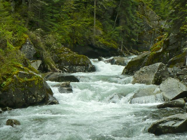 The threatened Chinook salmon, steelhead, and bull trout spawn in this river, traveling more than 500 miles and over several dams to do so. This isn’t spawning season, so I didn’t see any redds (nests) in the gravel bars or side streams, but I did see evidence of other wildlife: owl pellets, black bear tracks, elk scat, and a white tailed deer. Birdcalls and squirrel cries rivaled the river for attention, including two woodpeckers and a mother gray squirrel with her young clutched around her neck.