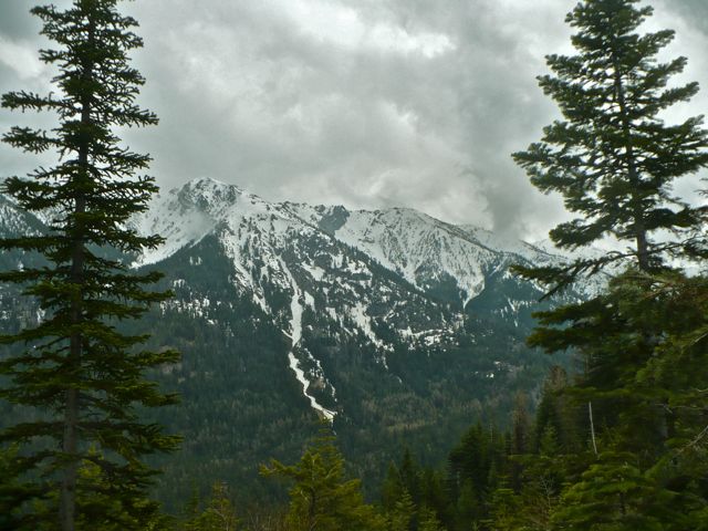 I didn’t get snowed out until Mile 7 at the Bowman/Frances Lake Trailhead. Four-wheel drive, ambition, and a healthy dose of stupid could get someone to the road’s end this time of year, but that’s not me. I parked and headed up trail in the direction of Chimney Lake. As soon as I hit the 6,000-foot elevation mark, the snow was so abundant on the trails that I lost interest. I did manage to enjoy lunch on a sunny, peaceful rock next to Bowman Creek. Here’s a view of Marble Point (9,100 feet, on the left) and part of the Hurricane Divide:
