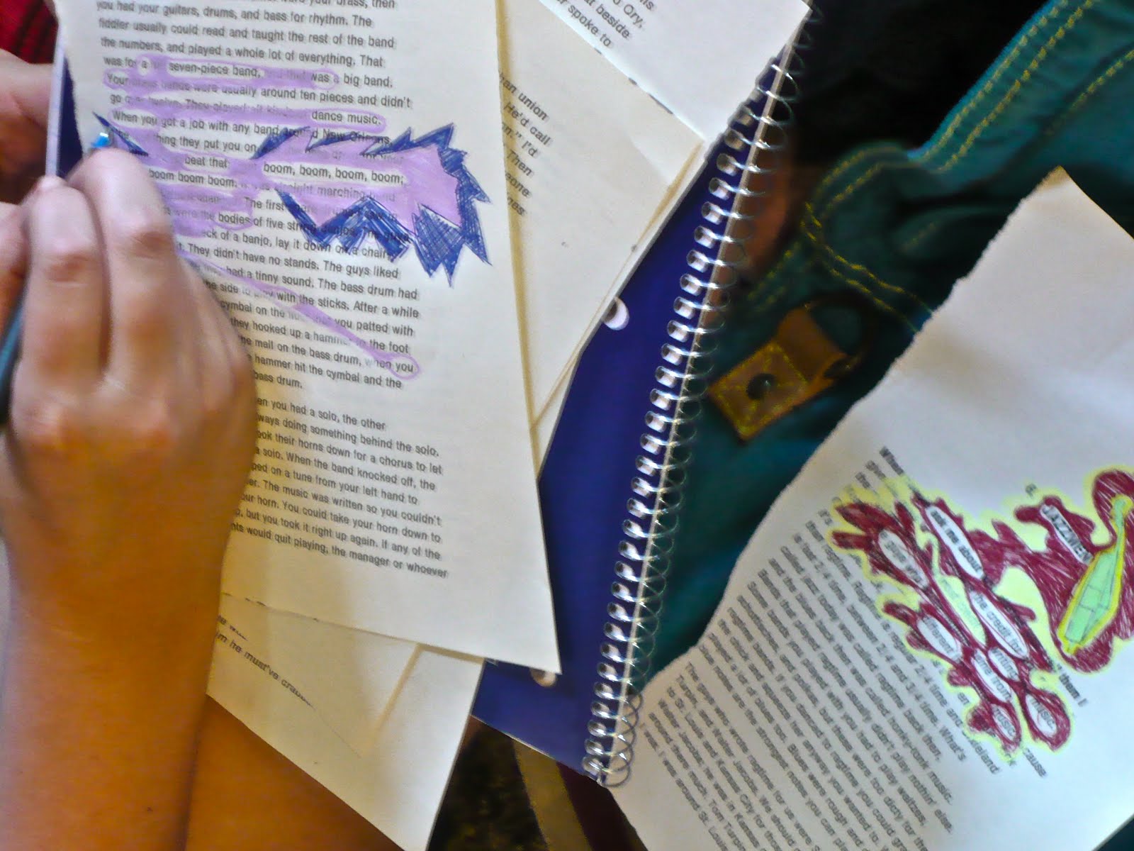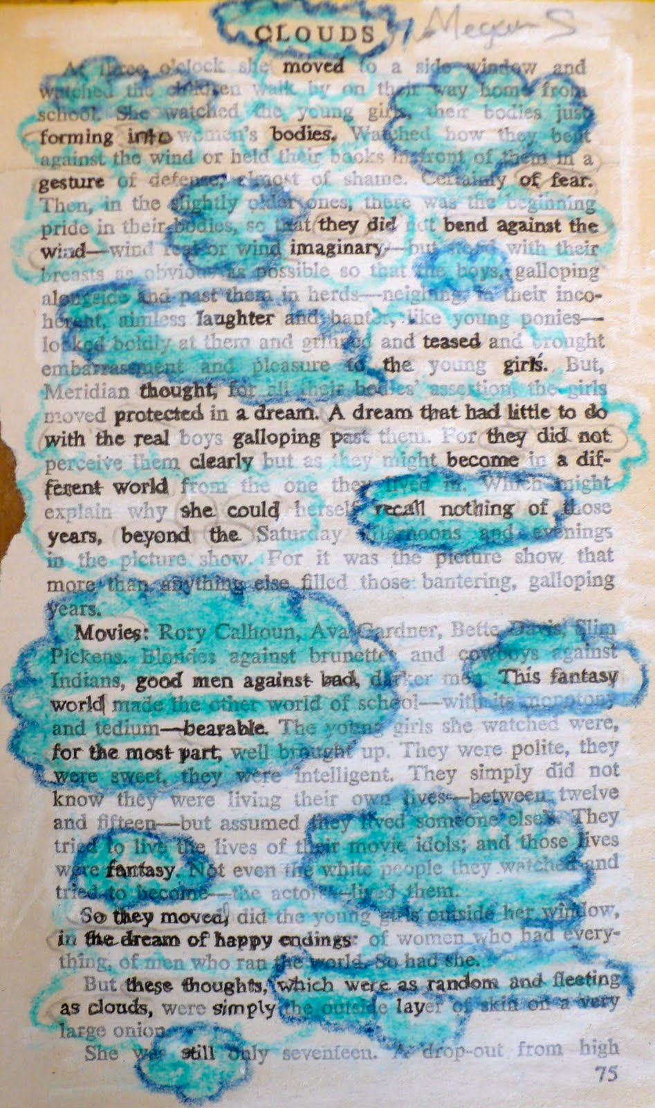 The students entered that wonderful space of focus again this afternoon as we continued working on our found poems in altered books. As someone who has spent a lot of time with teenagers in various indoor, outdoor, private, and public school classrooms, I can say that no matter where you are or what population of students you’re working with, there is a distinct sound teens make when they’re focused like this. I like to call it the ecstatic hush and it’s truly exciting to hear. A little tremor of creativity seems to be traveling upward from the core of the Earth and out through their fingertips. It gains speed as it moves and at times the classroom almost feels as if it’s floating. They’ve taken off, so to speak, and in my best moments as a teacher I am not needed for teaching at all.