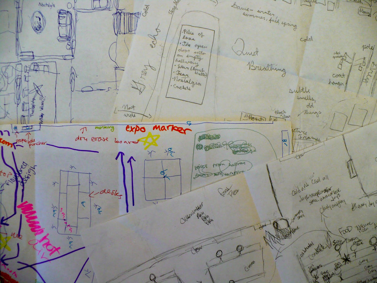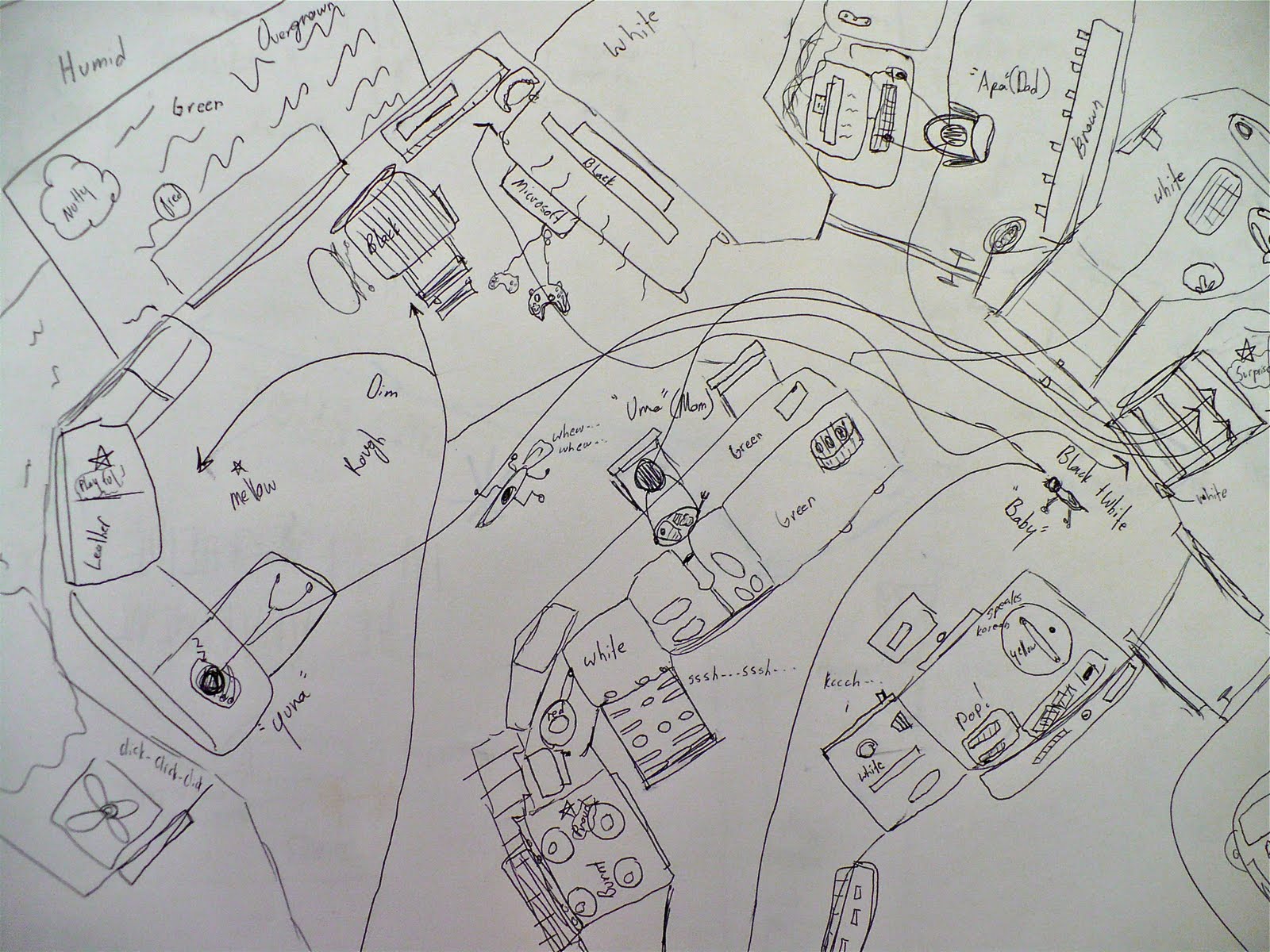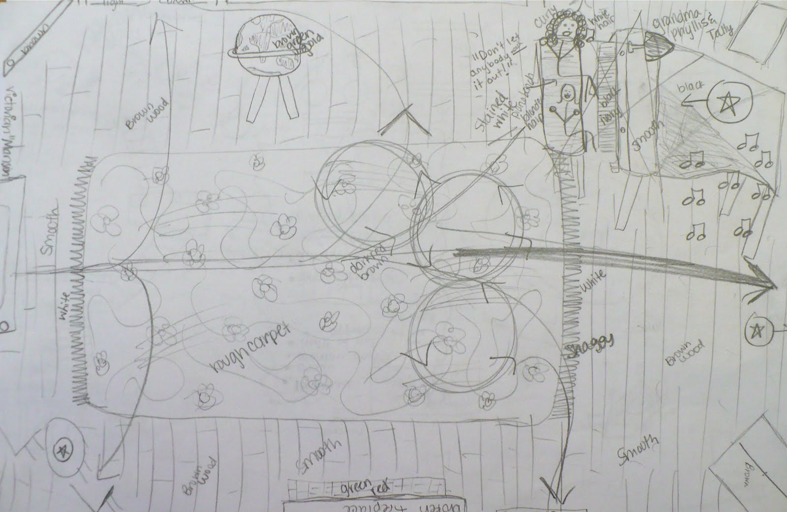 The steps are involved, but here’s a shorthand version of the order of operations: sketch blueprints of basic structures and objects in the place; label (using words) colors, sounds (including dialogue or repeated phrases), smells, tastes, textures, and proper nouns; label movement or “traffic flow” with arrows; mark scene-specific memories with a star; and create a text box to list the overarching emotion, feeling, or mood of the map. If possible, I also ask students to consider what is on “the other side” of the boundaries created by their maps, and to ponder how that contrasts with the world they’ve sketched in detail on their papers. Here are a few examples from today’s classes: