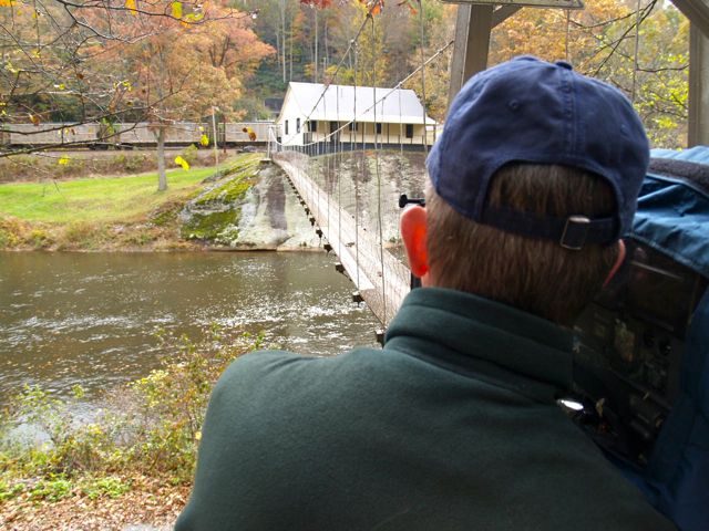 I’m moved nearly beyond words tonight, having just spent the day with a professional director, cinematographer, and audio specialist who believed enough in Lost Crossings to turn WNC’s footbridges into a featured slot on their television show. The “Our State” show is broadcast on UNCTV, an affiliate of PBS. This show has won 7 regional Emmy Awards and the director who selected my project has worked on PBS documentary films for decades. The episode featuring Lost Crossings will air on July 5th at 8pm and my ten-minute segment is allotted 1/24th of their annual budget (over $8000) for completion. Wow! In addition to airing on PBS, the episode will be available on YouTube.