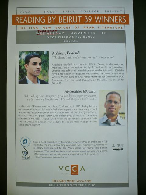 But yesterday afternoon, Rahim and Aziz (the two writers from Morocco) came to my studio to look at my notes. They lit up when they saw those two words–yalla, yalla–in their own language, so many miles from home, in this little writer’s studio in a small town in Virginia. I told them I also knew inshallah (God willing) and shukran (thank you), but that was all. They taught me “hello” (which I’ve already forgotten) and goodbye (salaam, or peace…much like the greeting, asalaam alaikum). Between our afternoon visit, and their public reading and banquet a few nights ago (which involved translations from Arabic into French into English and back), life at VCCA these past few days has felt delightfully international. I’m soaking up every minute of it.