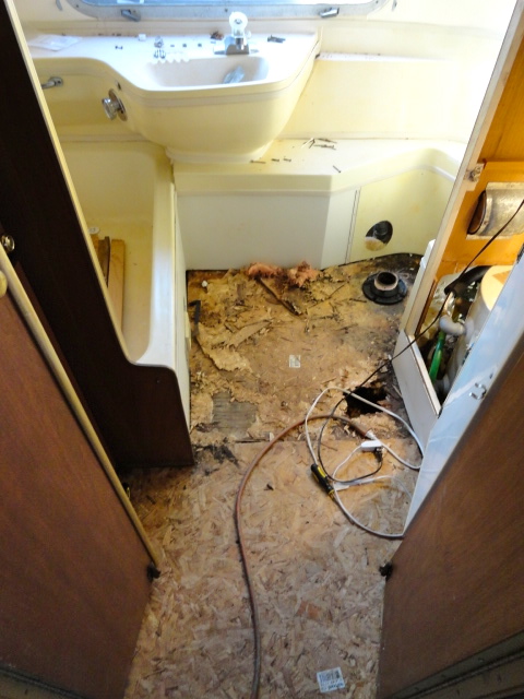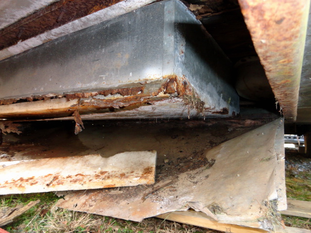 Of course, there’s the back end of the Airstream, which Dad diligently tackles each day and which I just as diligently deny is there: the bathroom. Dad’s already ripped the carpet up, extracted the toilet and water heater (taking the latter to the dump), and gutted the insulation and piping from the bottom up. Working on his back with safety goggles and a Sawzall, he released the Airstream’s “belly skin” (as it is called) to find this ugly mess. He sawed the rest away beneath the bathroom and junked it all before I even had time to finish letting the Pledge dry on the indoor wood paneling. It’s been one week of ownership and my, are we having fun!