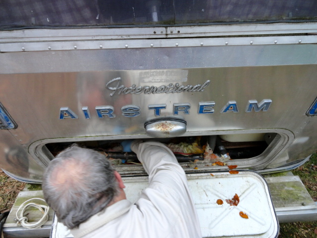 Unwrapped the electrical cables from rear bumper. Opened back door and rear side panel. Pulled out all the insulation–some of it wet–to expose hot water heater compartment and rear plumbing compartment. All the copper piping has been replaced with plastic. Connection to hot water heater seems in tact but floor under heater very wet. With Katey pulling on the pipes inside the trailer, I was able to trace which ones go where…Back rear corner has a box with a button in the middle. Out of the box comes a short, stout, two-pronged cable which might be the hook up for the battery. Plate on back of camper says it is a 110-120 AC and 12v DC system…Waiting for a manual to confirm many assumptions.