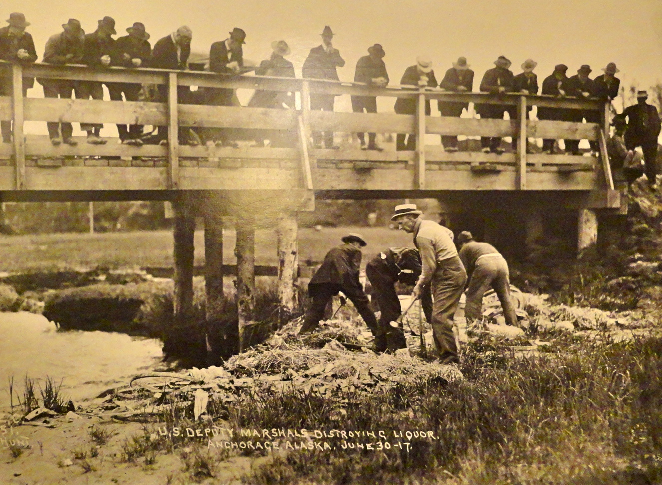 Here’s a photo of US Deputy Marshals destroying liquor in downtown Anchorage. The barrels were typically used to store moonshine and busting through the wood apparently made quite a show. Whether it made enough of an impression to stop the production and sale of liquor isn’t in question, though–because it most certainly did not.