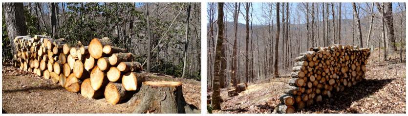 All totaled, we’ve felled one giant old hollowed widowmaker, two hemlocks, and one tulip poplar. But felling trees is only part of the job. Once they were bucked up, I had to shimmy down the steep eastern and western slopes of the land and hand carry, roll, or wheelbarrow load after load of rounds to level ground so that they can be split. At least now Mom and Dad will be set for firewood for a few winters and my trailer will have a cleared spot of land to rest. Here’s two wood piles I busted my back on this weekend, plus one shot of the main tulip poplar trunk rounds that we’re going to have to peavey or tow uphill. Note the ridgeline view in the background of the highest peaks this side of the Mississippi: