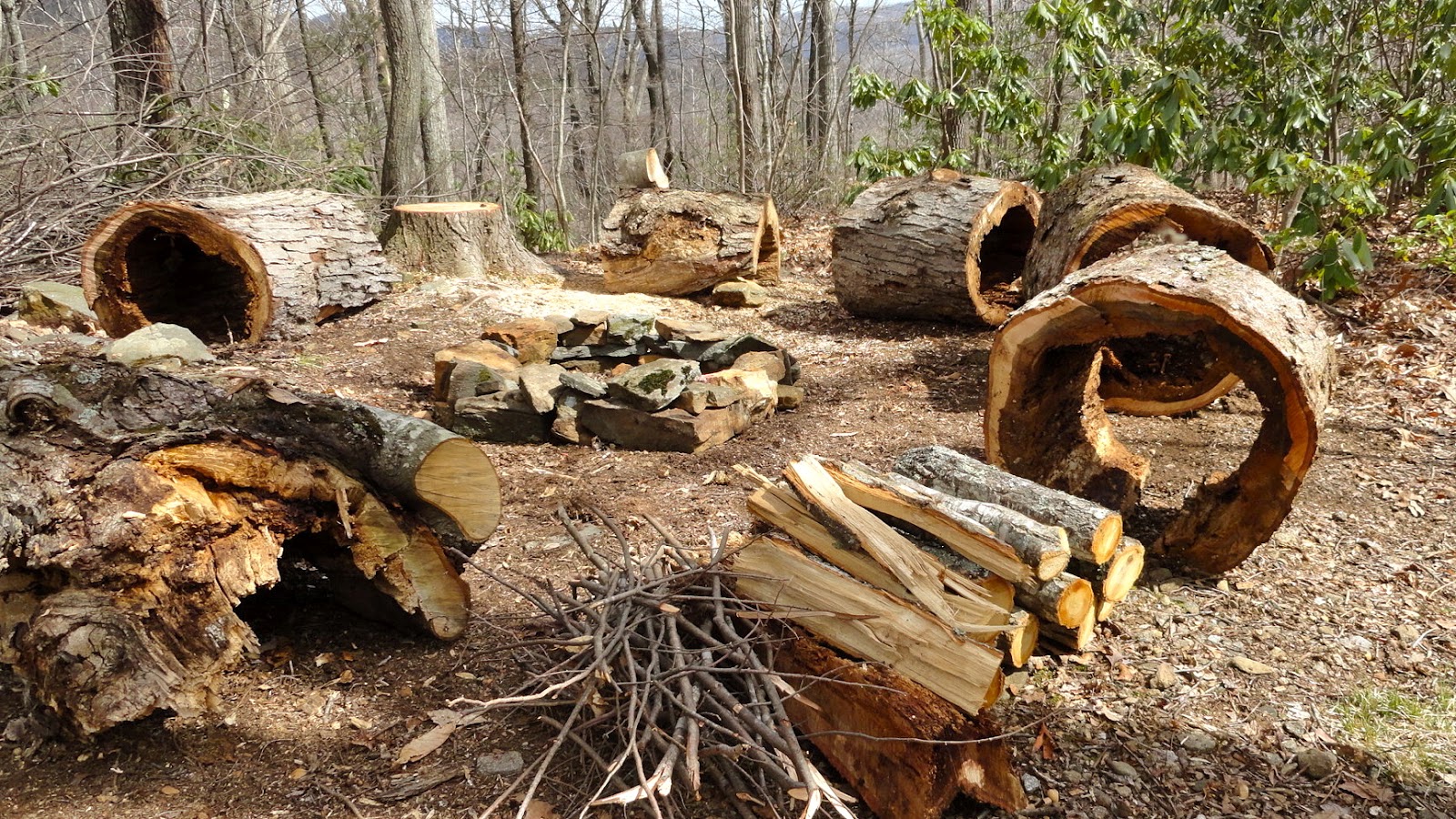 Sometimes, when the goin’ gets slow (and the chainsaw chokes on the ethanol in the gas mixture) the only thing to do is set everything else aside and focus on a task you can start and finish in a simple matter of hours. For me, that meant arranging a fire pit at the far edge of Coon Ridge–behind where the rear end of the Airstream will actually sit. Back in December, Dad felled the red maple widowmaker across the main clearing on the land. Once it came down, we saw just how truly hollowed out the tree had become. It was a relief to know it wouldn’t be able to fall on the trailer–but now what to do with it?