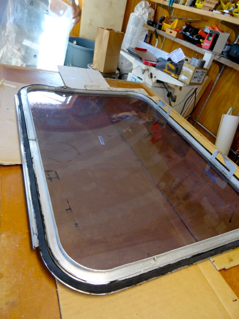 We also learned how to apply gasket (or weather stripping, as some sites call it) to the windows and side access portals for the Airstream. The first strip went on in a painful disaster I don’t care to recount. But the second and third strips went on without a fuss and tomorrow we may just be able to say we have 1 window–screen, frames, armature, and all–fully fixed and reassembled. Maybe. Here’s a shot of a living room window with its new weather stripping nicely adhered to the sparkling clean (and hard worked for) window flanges. I’ll spare readers the details of what it was like removing 42-year-old weather stripping, de-gunking the old adhesive, and finally, using steel wool and polish and lacquer to prepare the surface for the new stuff you see here.