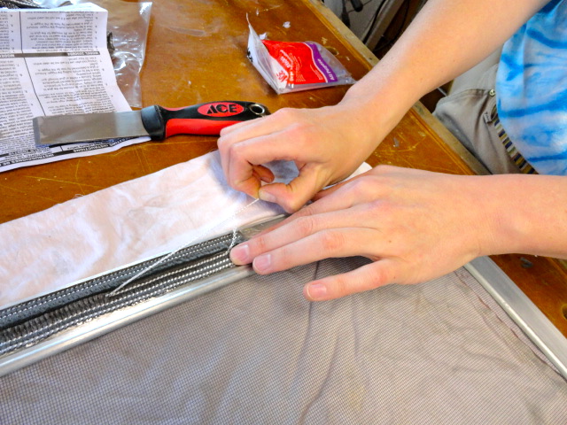 And so it goes…another day of trial and error, another day of small successes and frustrations. It’s all part of the deal, and nobody said this would be easy. At the end of the day, it still feels good to be able to say that progress was made and new skills acquired. Some of today’s lessons? That hot glue gun glue dries a lot faster than the packaging says. That when working with bug guard, the trick is to adhere it to the screen frame flanges well enough that it’ll do the job, but not so firmly that it can’t be ripped off or easily adjusted if needed. Likewise, the third white thread on every piece of bug guard that’s cut needs to be pre-loosened and not pressed into the hot glue so that later it can be un-threaded.