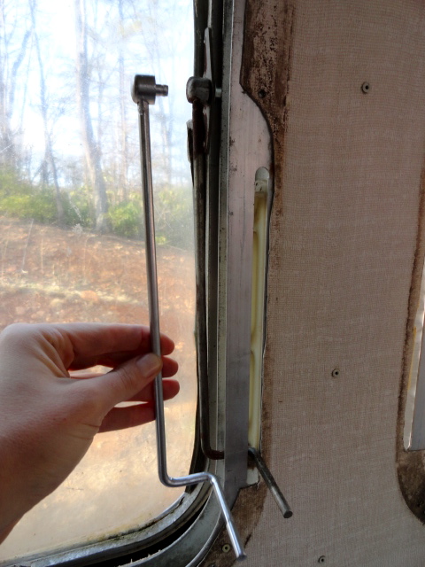 The surprise of the day? In removing one of the side access panels to replace the weather stripping, the lock handle accidentally slipped into place. No problem, you might think. Just unlock it. Oh, if only it were that easy. Who knows if and when and where and how that key ever existed…but a replacement is $40 and that’s just for one side panel (not the others, and not the front door, either). We might do better disassembling the entire lock mechanism itself. And so it goes…one thing leading to another to another to another…Meantime, I’m officially in love with Rust-Stop “aluminum shine” spray paint, which cleaned up this rusted (then sanded and prepped) window armature with pleasing before and after results: