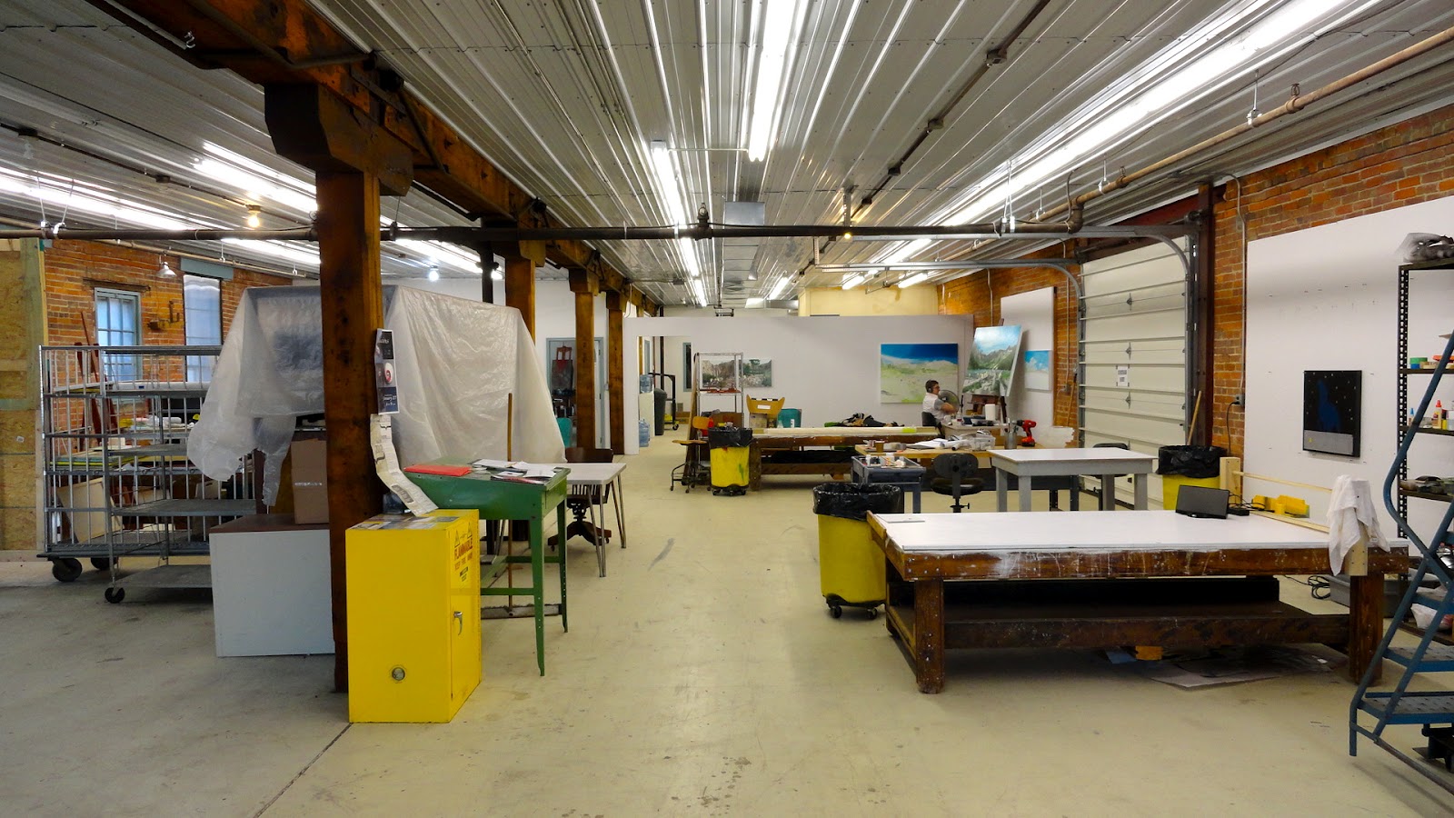 Studio space is shared at Prairie Center of the Arts, but if you can imagine a 90,000 square foot building with four artists in it, you’ll have a sense for how vast the studio space here actually feels. The Cordage Building, built by the Peoria Cordage Company over a hundred years ago, is part of the industrial and commercial neighborhood of downtown Peoria. There’s a whole lot of story in that last sentence, but I’ll save that for posts to come. As it is, painters Cobi Moules, Maureen Gasek, and Ron and I hop into the van each morning and head on over to the studio.