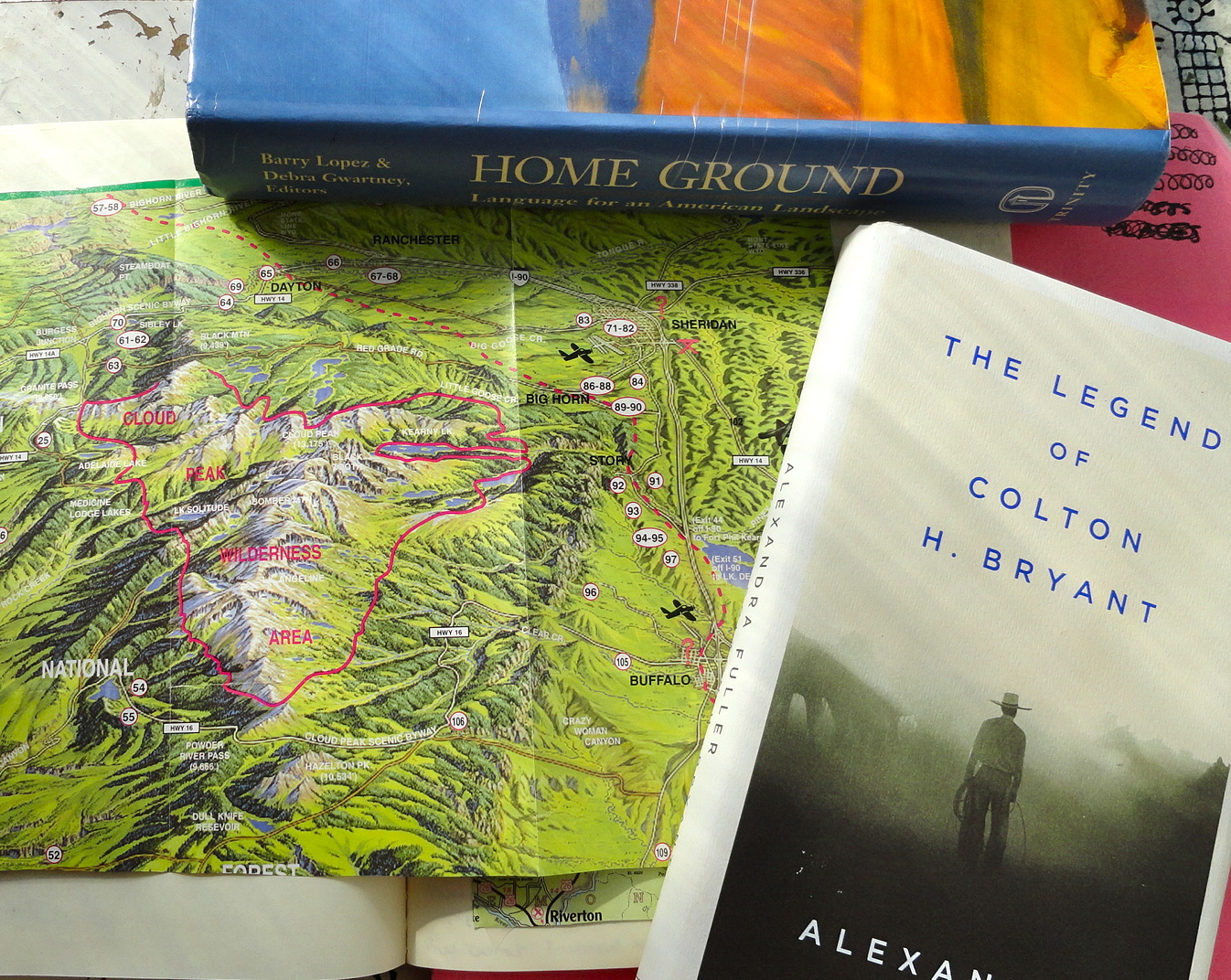 When I “warm up” for generating new material on the Wyoming essay, I look at photos I took while at Jentel, thumb through my scrapbook to study old maps, and review definitions of landscape terms in Home Ground. Even the simple act of pausing to stare at a photo (sense of sight), un-creasing the folds in an old map (sense of touch), questioning the connections on my bulletin board map (sense of wonder), and studying the story of specific words (sense of history/time) engages me on enough levels that before I know it, I’m jotting down new ideas in my journal. Inevitably, the free-writing leads me to the keyboard and with all that momentum going, I’m just about always able to create something new.