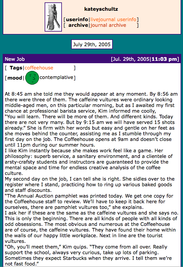 I guess I’m saying all of this, because in retrospect, I had no idea what I was doing on dial-up Internet access in the backroom of the Penland Coffeehouse that first night after my first shift in my “new job.” There were these things called blogs, and in 2005 they sounded nifty and new. I thought I’d start one. The manager had me come in early that day to work with her and train, before the evening shift. I decided to write about it. Here’s a screenshot of that first post, in full, way back when LiveJournal was all the rage:
